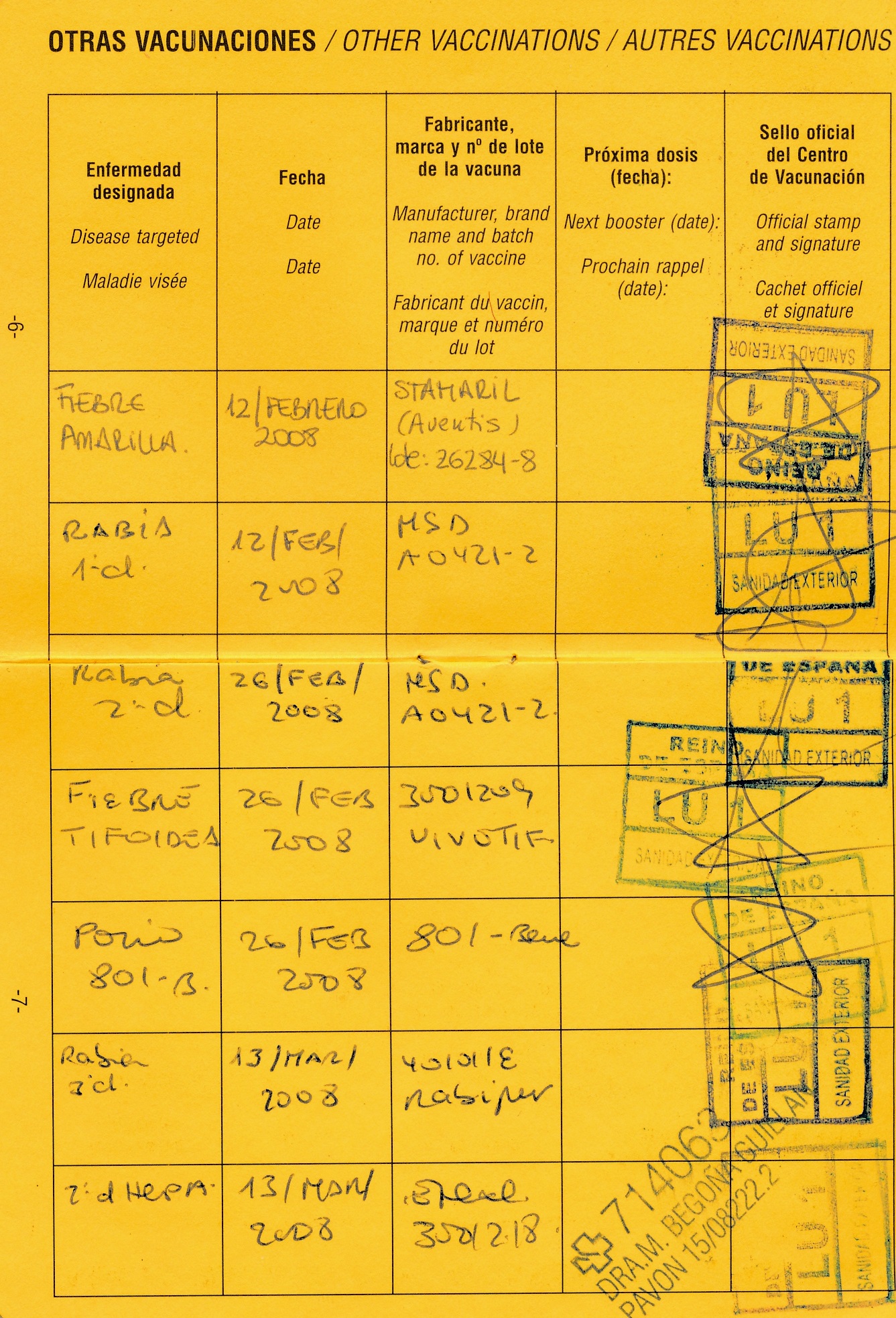 En ningún viaje anterior había requerido una vacunación tan variada y abundante; la cartilla de vacunación internacional así lo atestigua. Los efectos secundarios más importantes aparecieron a los pocos días de recibir la vacuna de fiebre amarilla, con fiebre muy elevada que me obligó a acudir a urgencias.