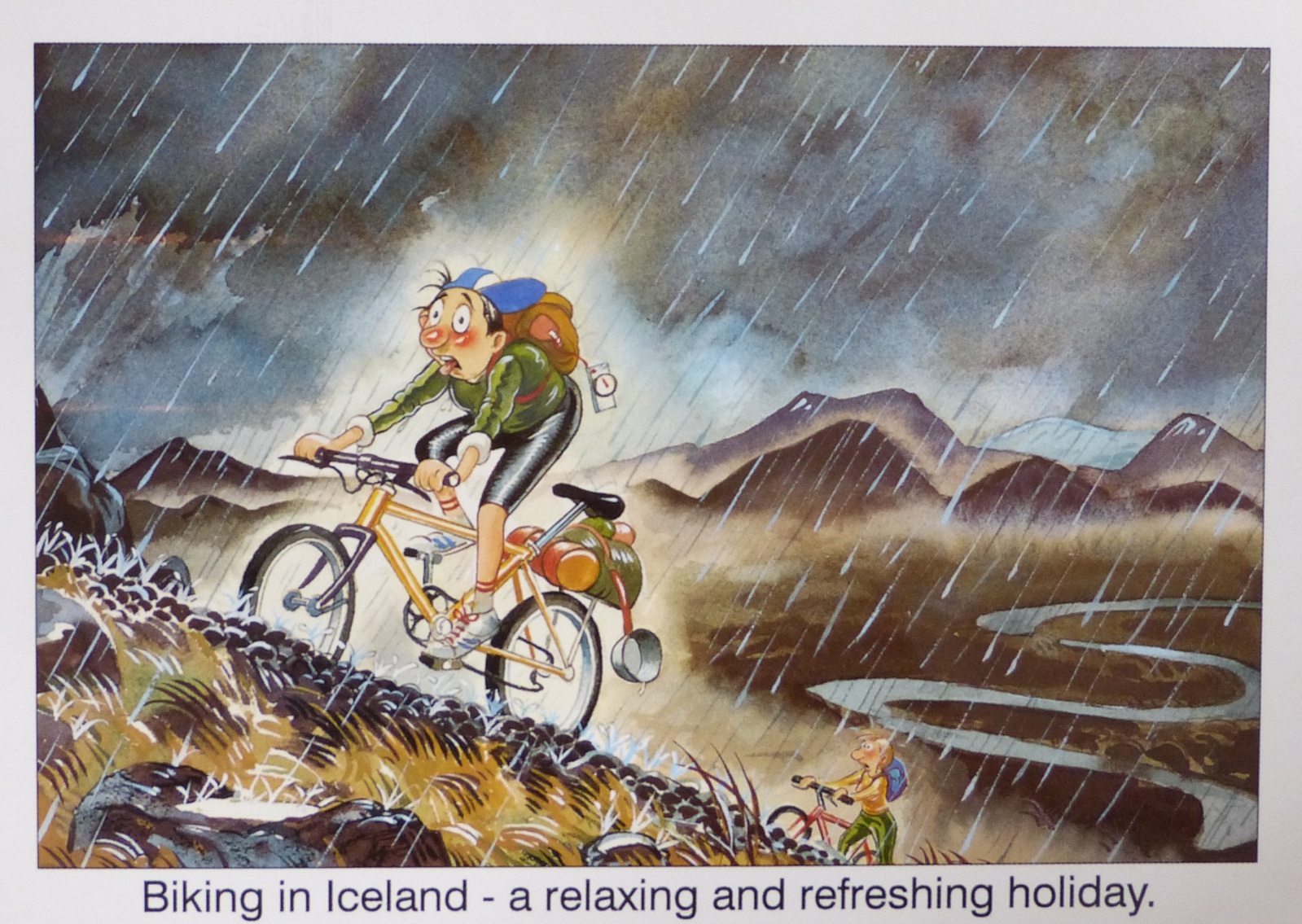 A pesar de realizar el viaje en época estival hay que ser muy precavido con la ropa. La temperatura media de Reykjavik en julio es de 11º C. y 15 días de precipitaciones. A lo largo del recorrido tuvimos lluvia, fuerte viento y niebla. Representativo de lo dicho anteriormente es esta tarjeta postal que encontramos en un kiosco de Akureyri.