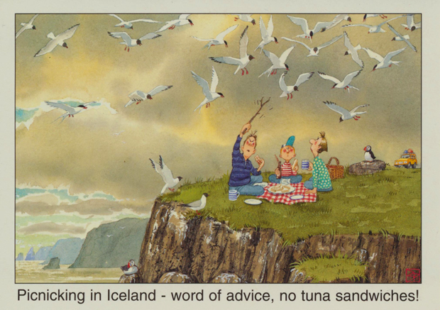 Ya en Islandia, y de forma inesperada, nos vimos sorprendidos por el acoso de una pequeña ave semejante a una gaviota: el charrán ártico (Sterna paradisaea). De plumaje blanco en cuerpo y alas y cabeza negra, anida en el suelo cerca de las carreteras, motivo por el cual defiende con celo su territorio y prole, lanzando ataques contra todo intruso subido a una bicicleta. Otro momento conflictivo es la hora del almuerzo como bien refleja la tarjeta postal.